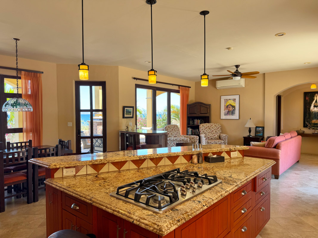 - Open‑concept gourmet kitchen and living area opening to a beachfront patio with seaside fireplace